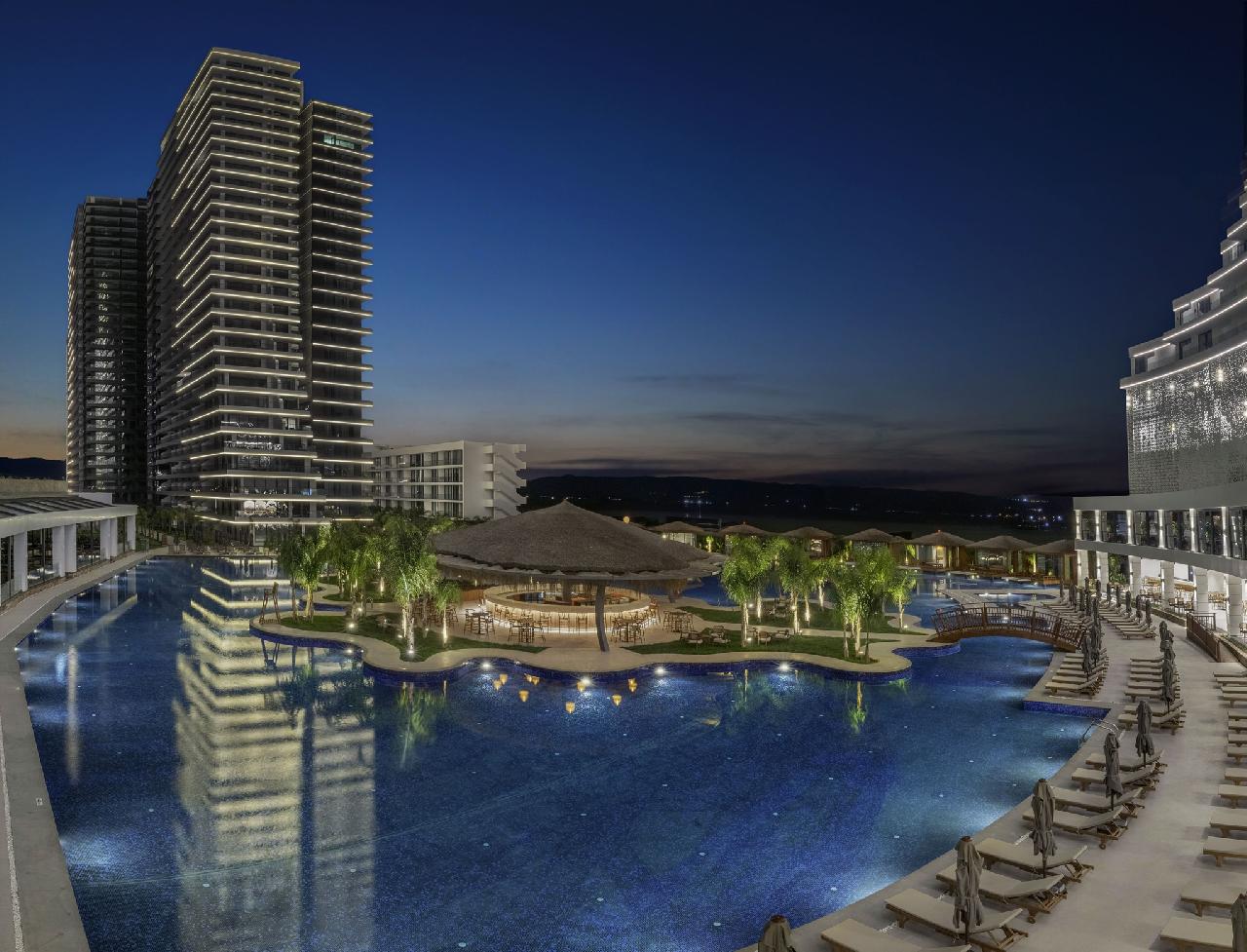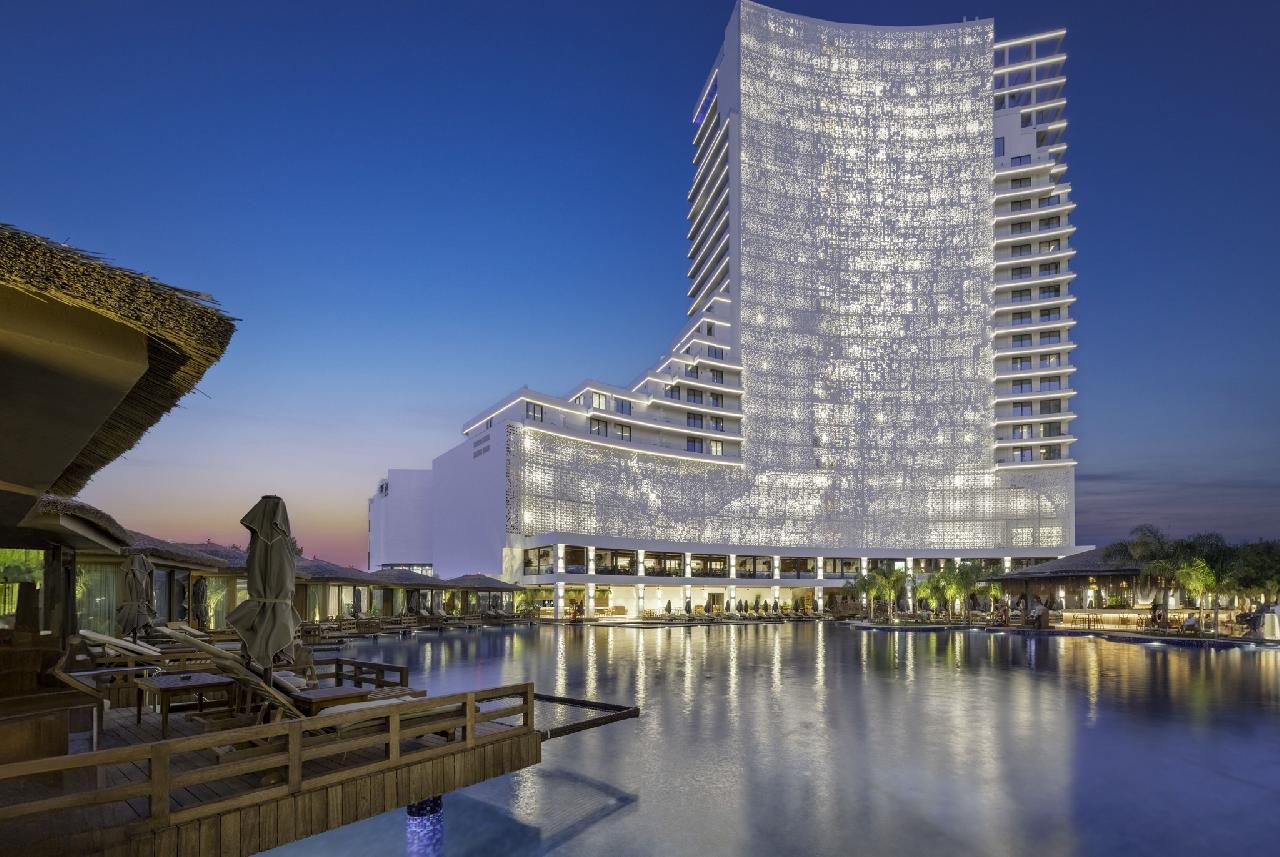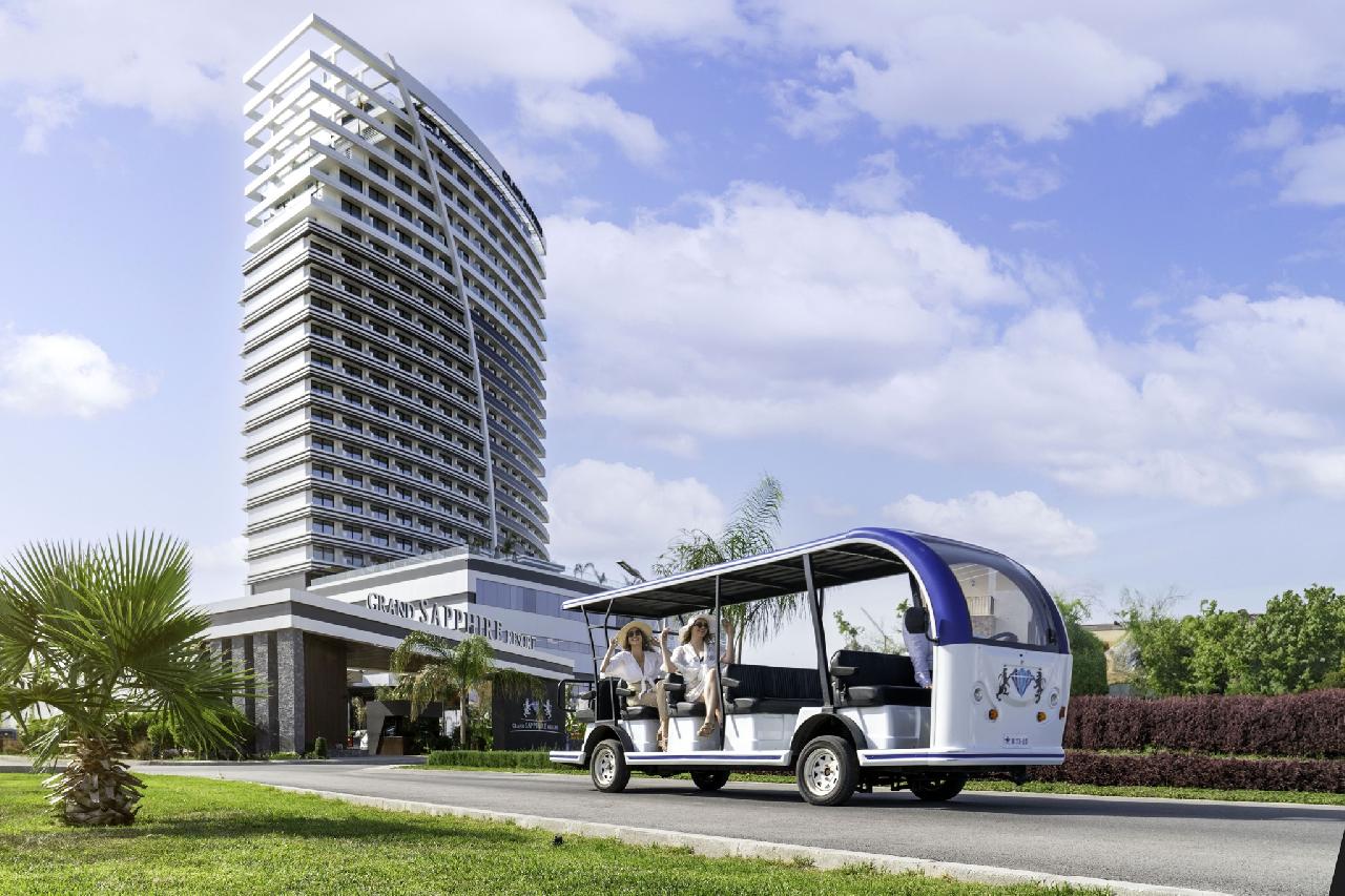 Fekvése: a 2023-ban megnyitott, ikonikus épületegyüttes több különálló toronyból és egy hatalmas, trópusi hangulatú medencekomplexumból áll, amelyet Észak-Ciprus „legnagyobb medencéjeként” tartanak számon. A szálloda grandiózus méreteivel, modern dizájnjával és kiváló szolgáltatásaival a régió egyik új luxusreferenciájává vált. A szálloda 700 méterre található a széles, homokos tengerparttól, ahol a hotel a vendégek számára privát partszakasszal, napernyőkkel és napágyakkal biztosít kényelmes pihenést. A partszakaszra folyamatos ingyenes shuttlejárat közlekedik. A Grand Sapphire Resort négy fő toronyépületben és több kisebb szárnyban(resort) kínál szobákat, összesen több mint 1200 luxuskategóriás lakóegységgel. A környék az elmúlt években az egyik legdinamikusabban fejlődő üdülőterületté vált Észak-Cipruson – új éttermekkel, bárokkal, üzletekkel és promenáddal. Famagusta központja kb. 15–18 km, míg a Larnaca nemzetközi repülőtér kb. 65–70 km távolságra helyezkedik el. A transzferidő a határátkeléstől függően kb. 90 perc. A szálloda tökéletes választás azok számára, akik egy ultramodern, új építésű luxusresortban szeretnének pihenni, kiváló létesítményekkel, hatalmas medenceparkkal, széles gasztronómiai kínálattal, saját kaszinóval és családbarát szolgáltatásokkal. Stílusa a mediterrán-török vendéglátást ötvözi a modern városi hotelérzéssel – így családok, párok és premium utazók egyaránt megtalálják számításaikat.