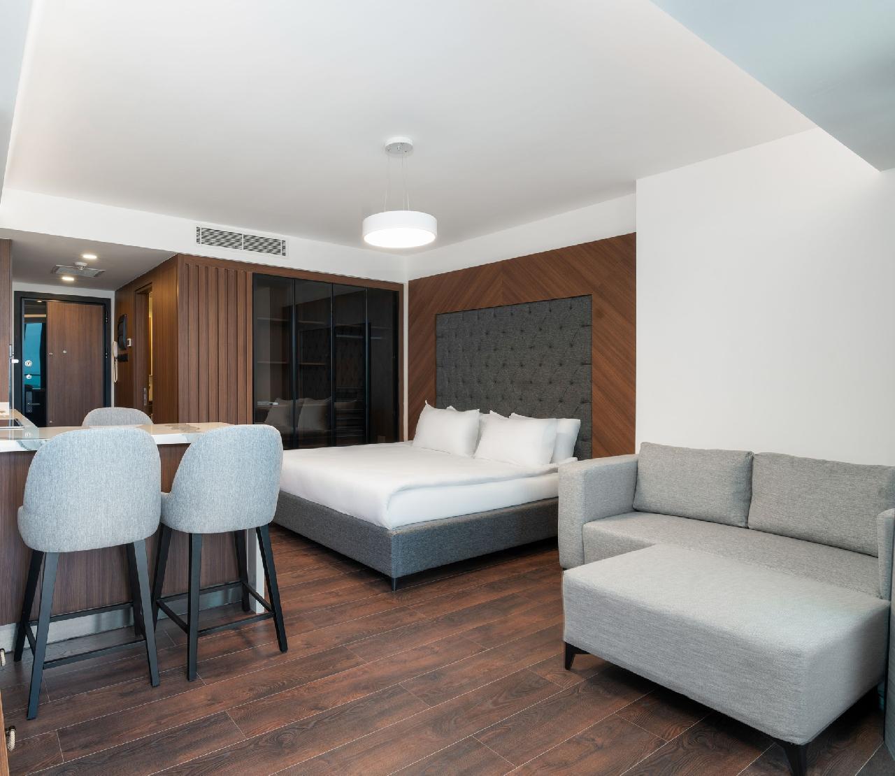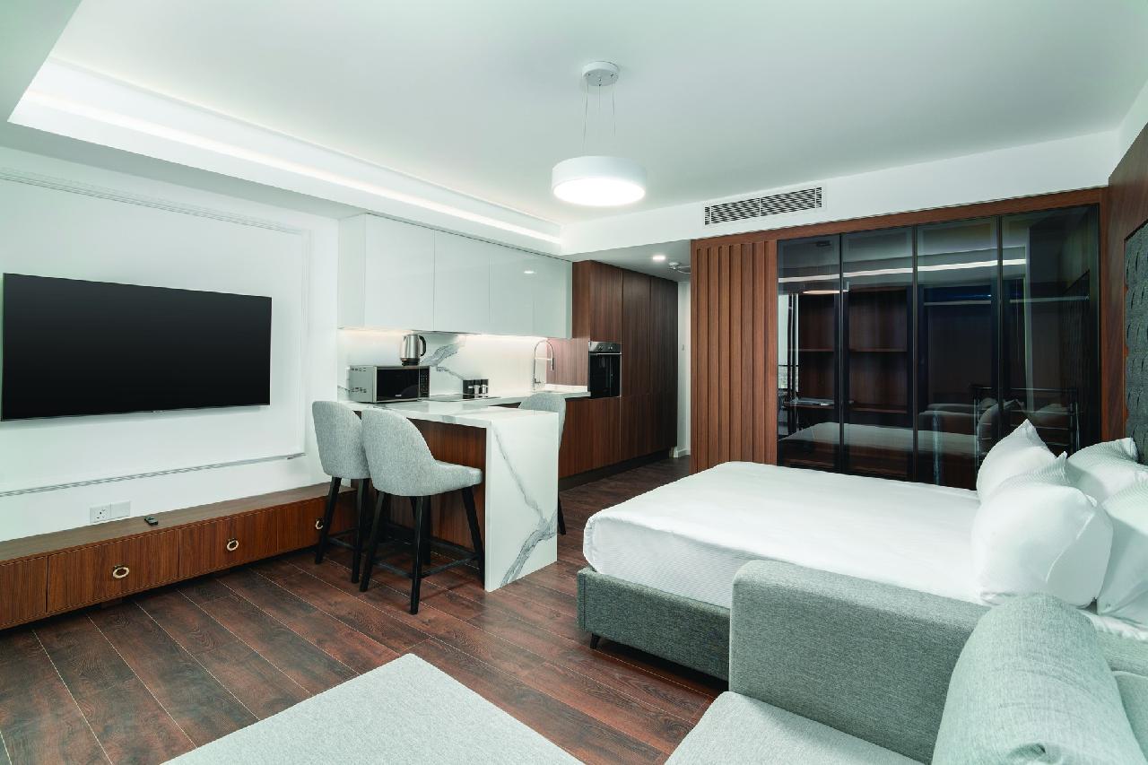 Stúdió szoba: kényelmet és az eleganciát ötvözve kínál felejthetetlen tartózkodást. A ~45 m²-es szoba teljesen felszerelt konyharésszel is rendelkezik, belső tere pedig meleg, otthonos hangulatot áraszt.