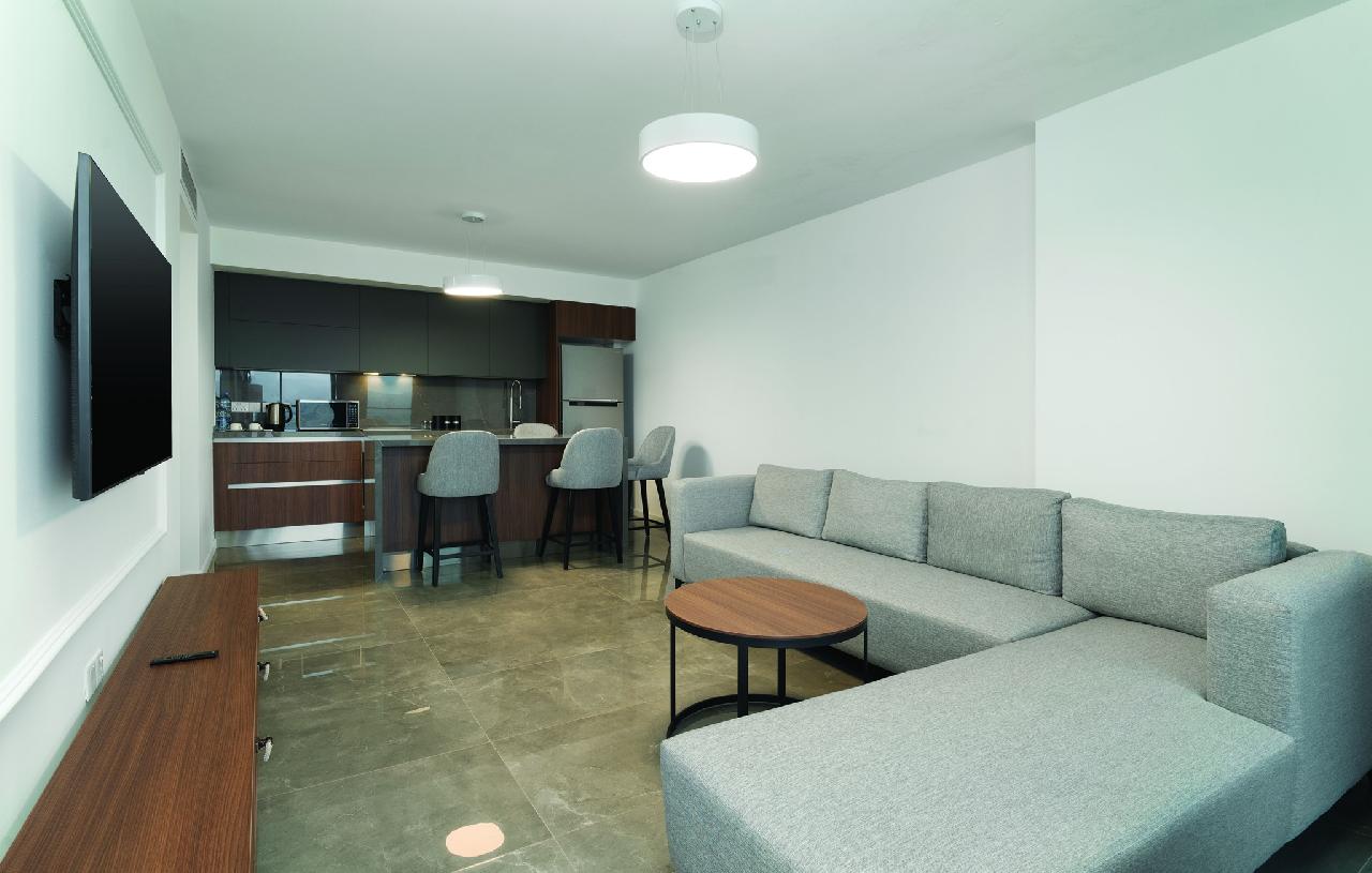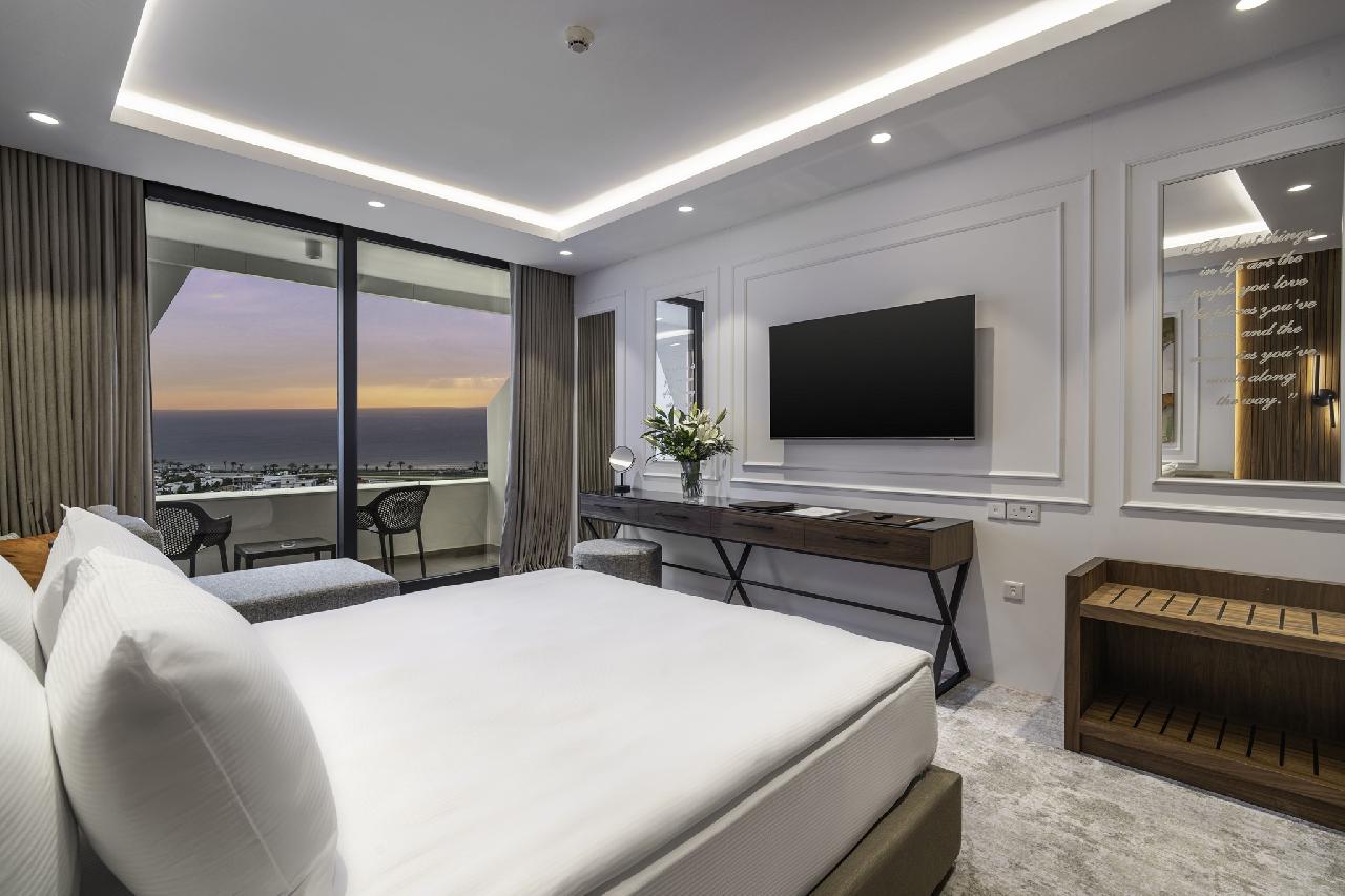 Szobák: minden stúdió és családi szoba a resort épület blokkban található, míg a szuperior szobák elhelyezkedése a toronyépületek egyikében. Mindegyik szoba modern, letisztult dizájnnal, elegáns bútorzattal és minőségi anyaghasználattal készült, légkondicionált, fürdőszobával, piperecikkek, hajszárítóval, síkképernyős tv-vel, telefonnal, hűtővel vagy minibárral, kávé- és teakészítési lehetőséggel, vasalóval és szobaszéffel felszerelt. A szobákhoz erkély vagy terasz tartozik szárazföldre, medencére vagy tengerre néző kilátással.